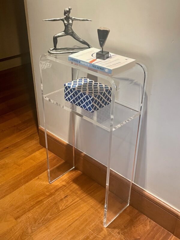 Aparador em acrílico translúcido incolor, curvo sem emenda, com prateleira.