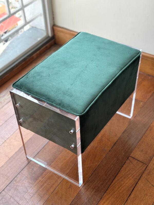 Banco de acrílico com acrílico maciço e estofamento.