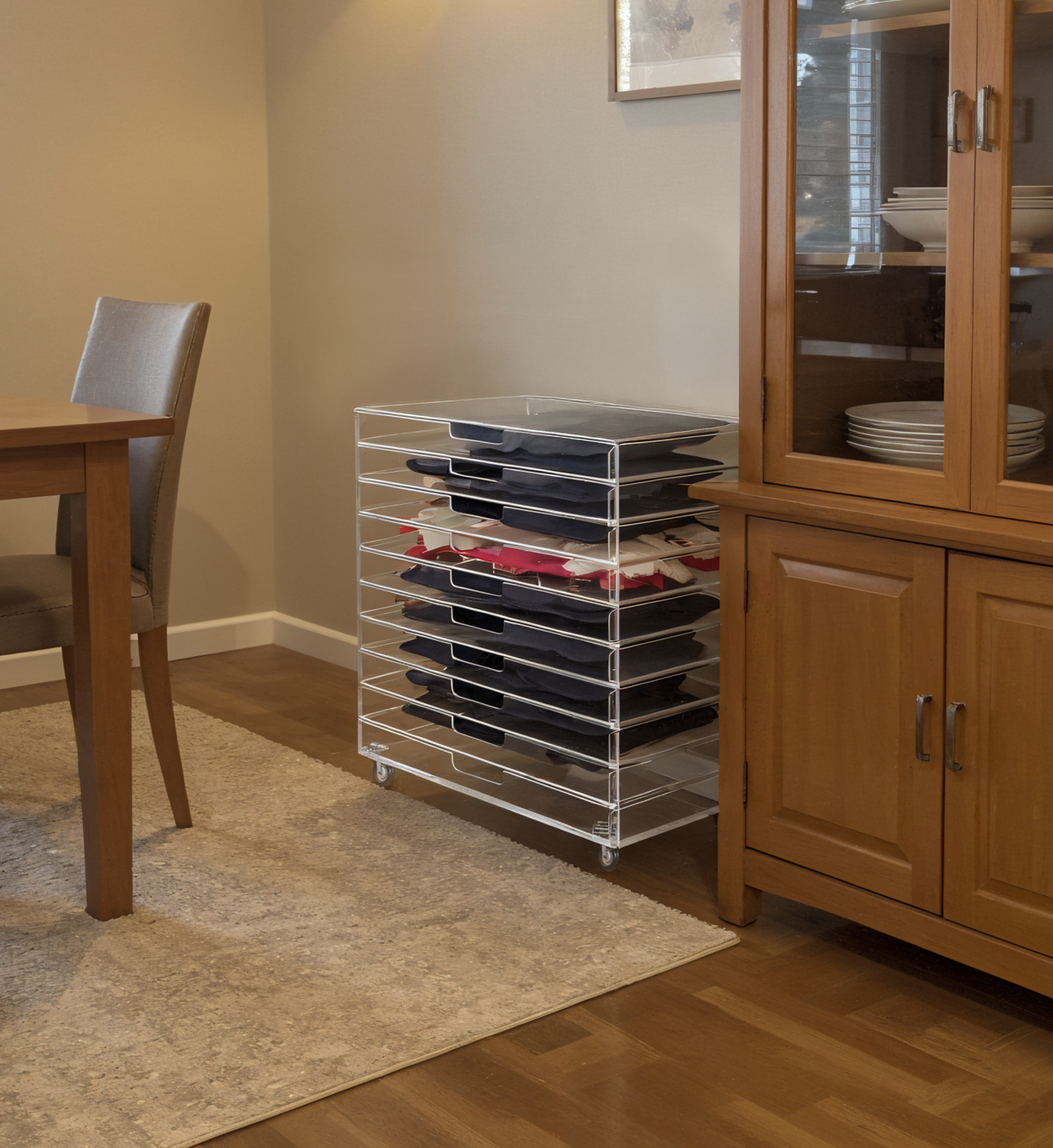 Carrinho gaveteiro organizador de acrílico para jogos americanos.