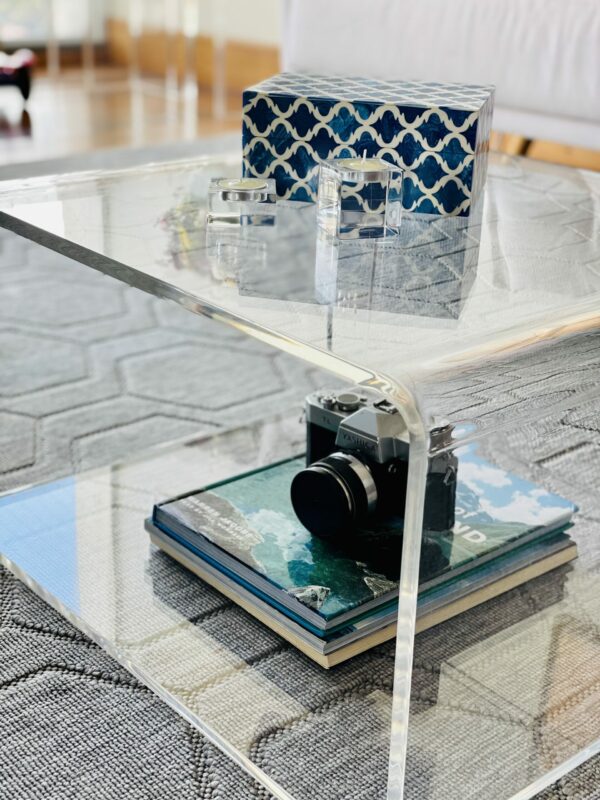 Mesa de centro de acrílico cristal maciço dobrada, com cantos arredondados.