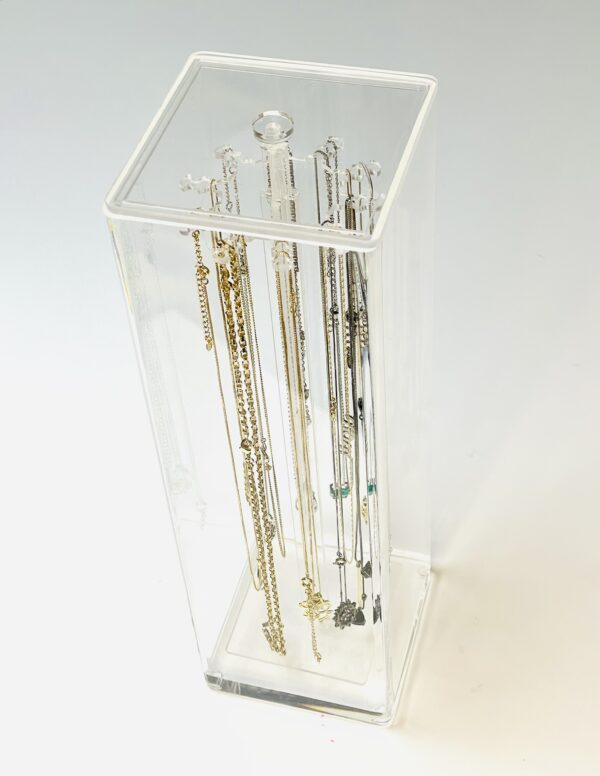 Caixa de acrílico desenvolvida para pendurar com organização e excelente visualização os mais diversos colares.