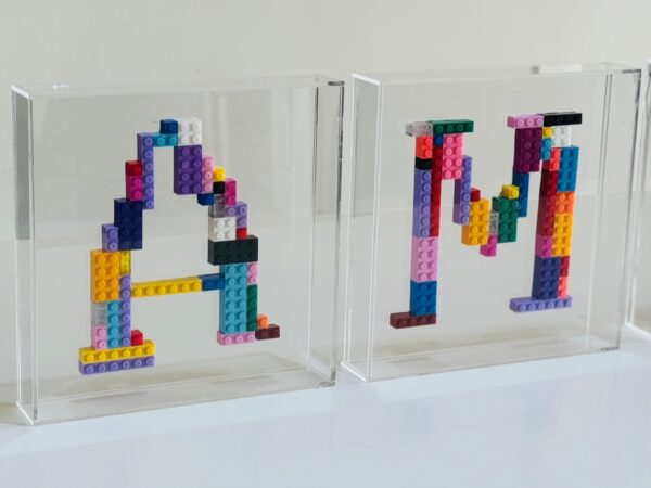 Quadro de acrílico com letra montada em Legos coloridos.