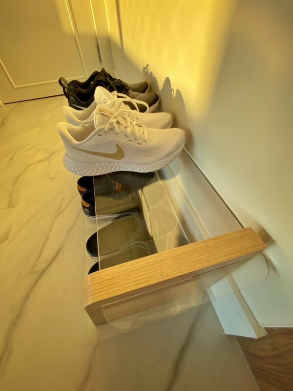 Sapateira clean em acrílico cristal com duas prateleiras que comportam três pares cada, com design arrojado.