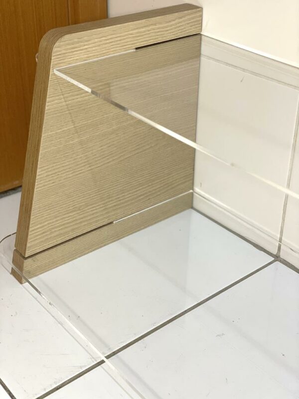 Material: Acrílico 6 mm nas prateleiras e MDF amadeirado 25mm nas laterais.