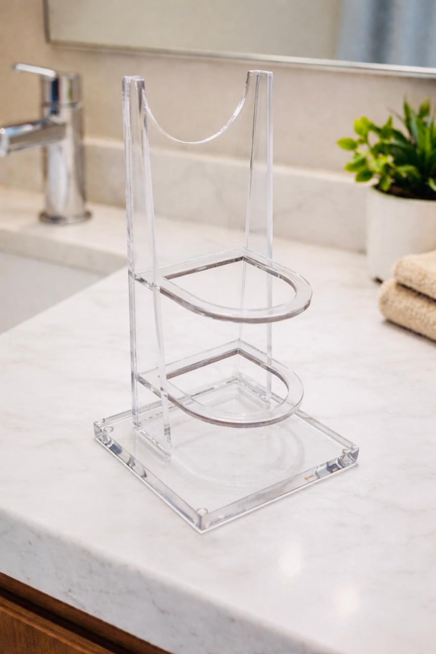 O suporte de acrílico Exhimia Home organiza de forma elegante os itens para arrumar e secar o cabelo. Feito em acrílico cristal de alta qualidade, oferece estabilidade, fácil visualização das peças e um toque moderno para o seu banheiro ou bancada de beleza.