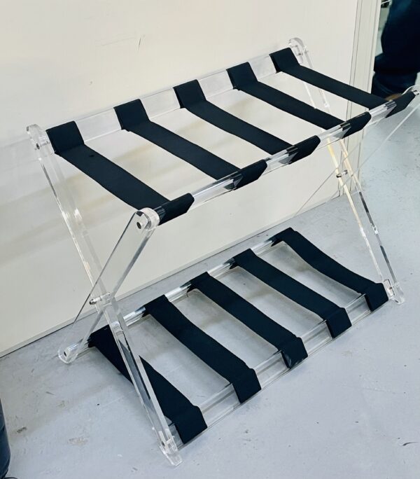 Suporte para organização das malas, produzido em acrílico cristal maciço, com fitas elásticas.