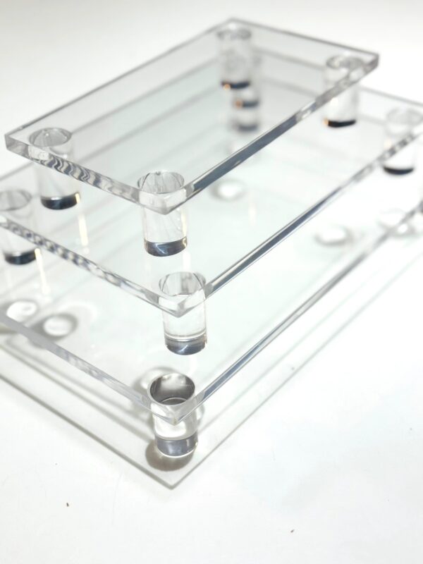 Material: Acrílico Maciço Cristal 5 mm e pés de tarugos de acrílico de 20mm