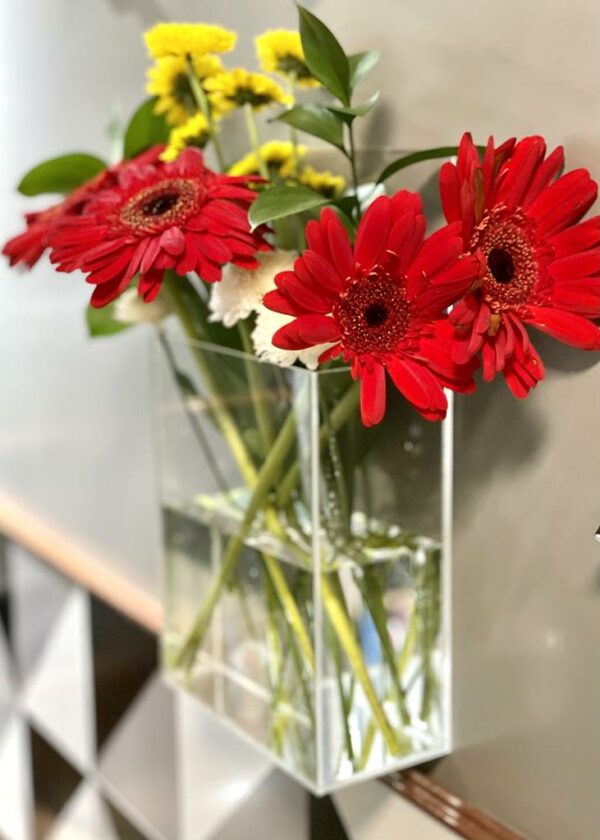 Vaso em acrílico cristal, com espera para prender na parede. Pode ser usado sobre a bancada e mesa.